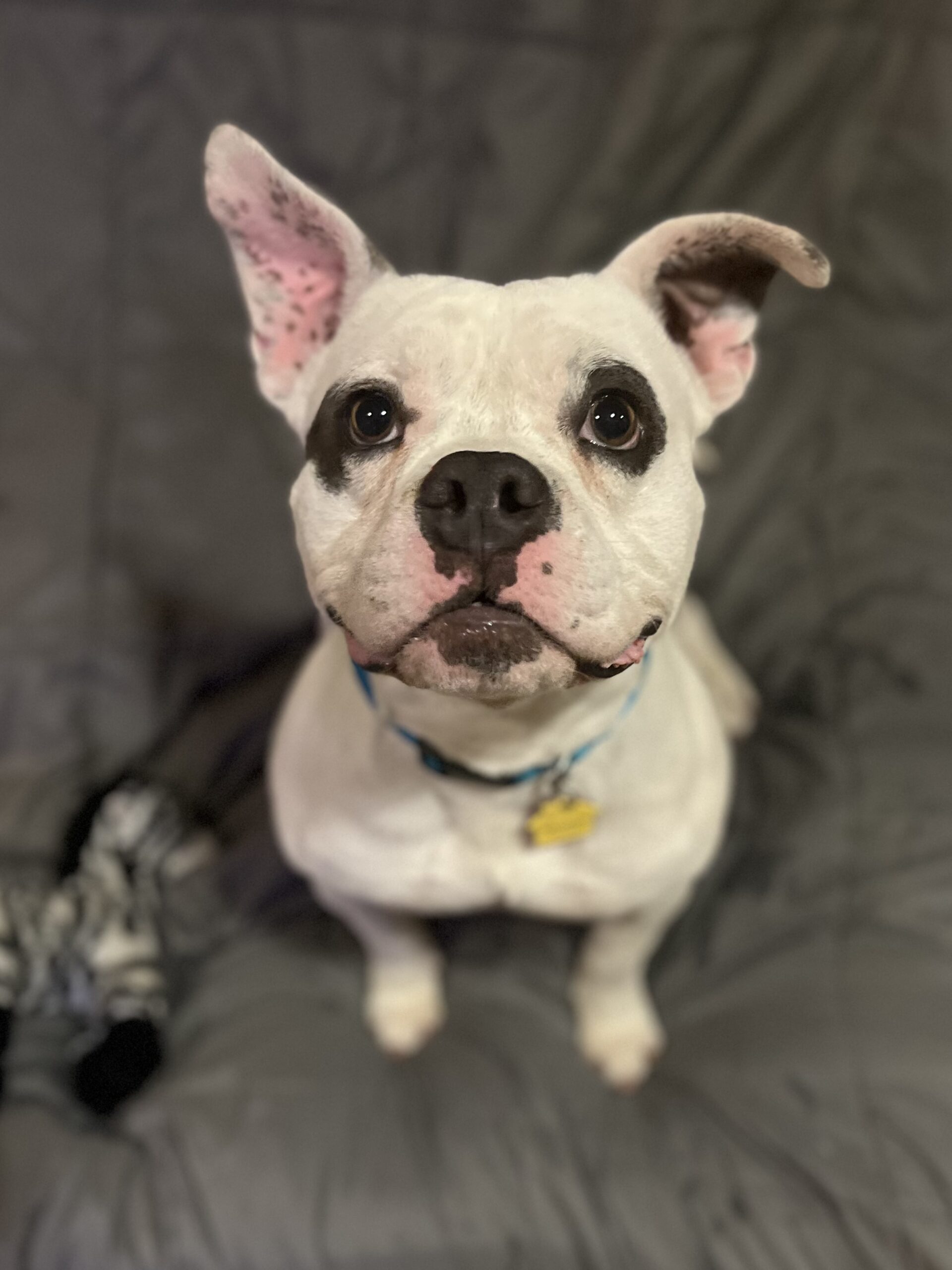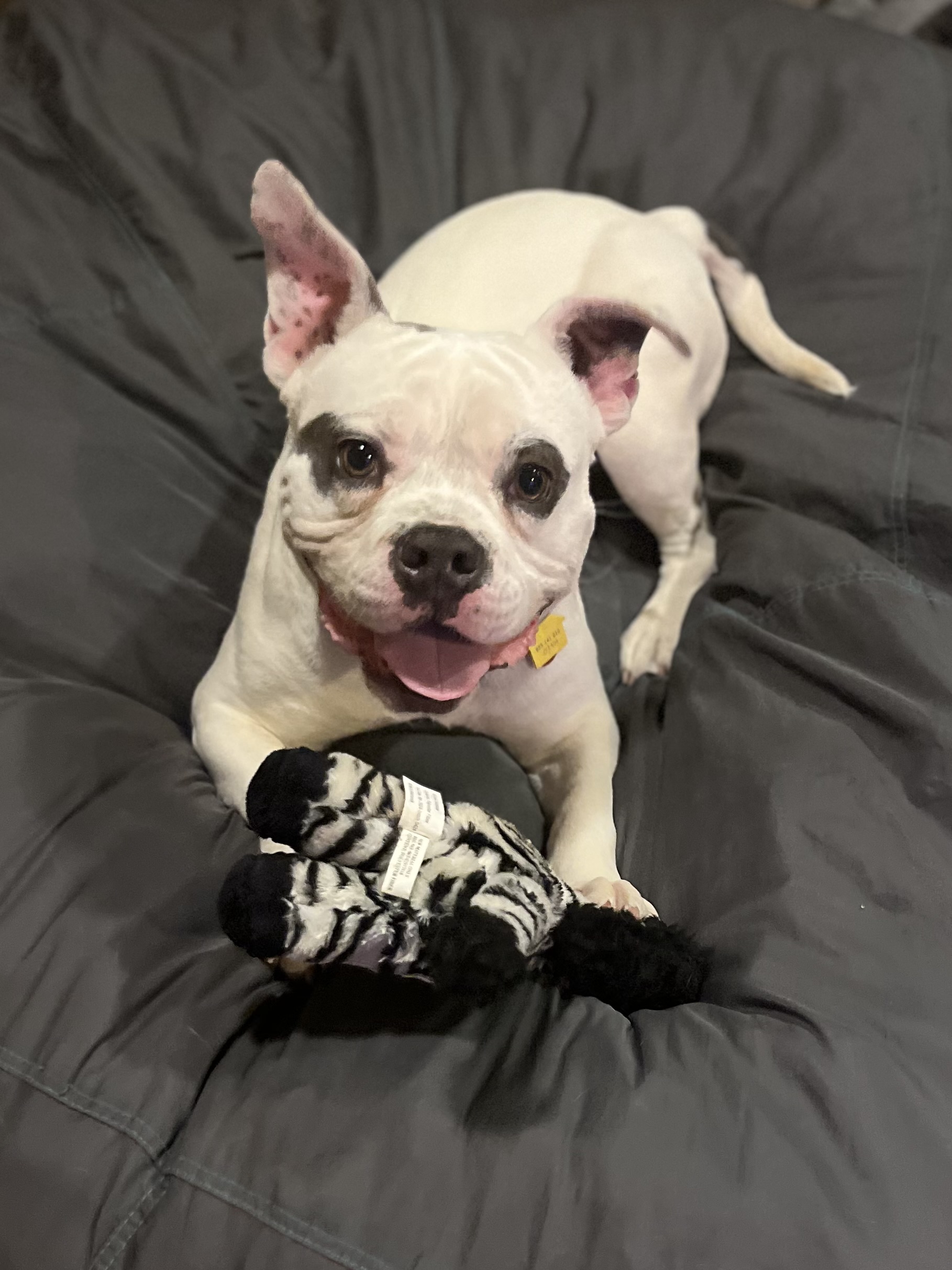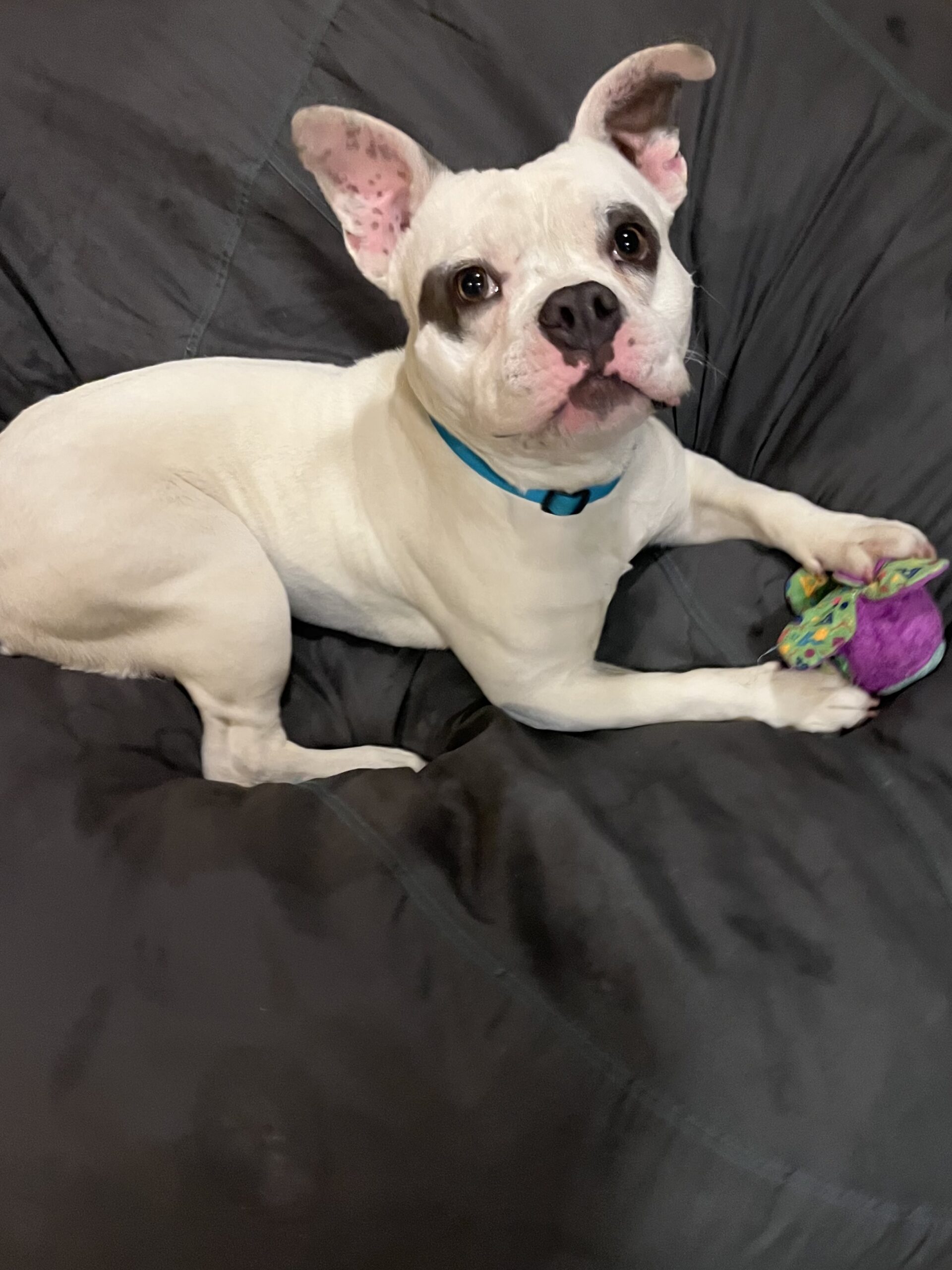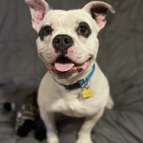 Franklin. Franko. Frankie. Frank the Tank. Whatever you choose to call him, this sweet boy will love you like no other. At 2 years old and just 36 lbs he has a big personality packed into a compact, muscular body. He is a hilarious goofball, a devoted best friend, and honestly kind of a lovable mess in the very best way. He plays hard, carries his toys with great pride, begs excitedly for snacks, and then crashes beside you for a cozy nap. He is housebroken and crate trained and is settling in nicely to life in his foster home. He is ready for a forever home with people excited to teach, love and grow with him. If you are looking for a cutie with a big personality and just the right amount of chaos, Franklin just might be your perfect match.