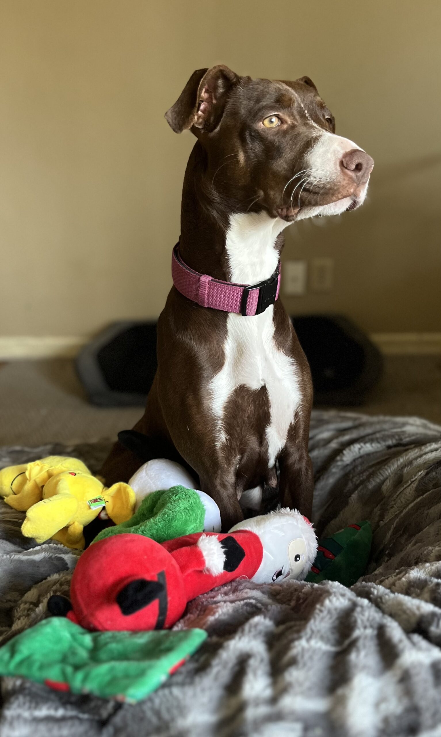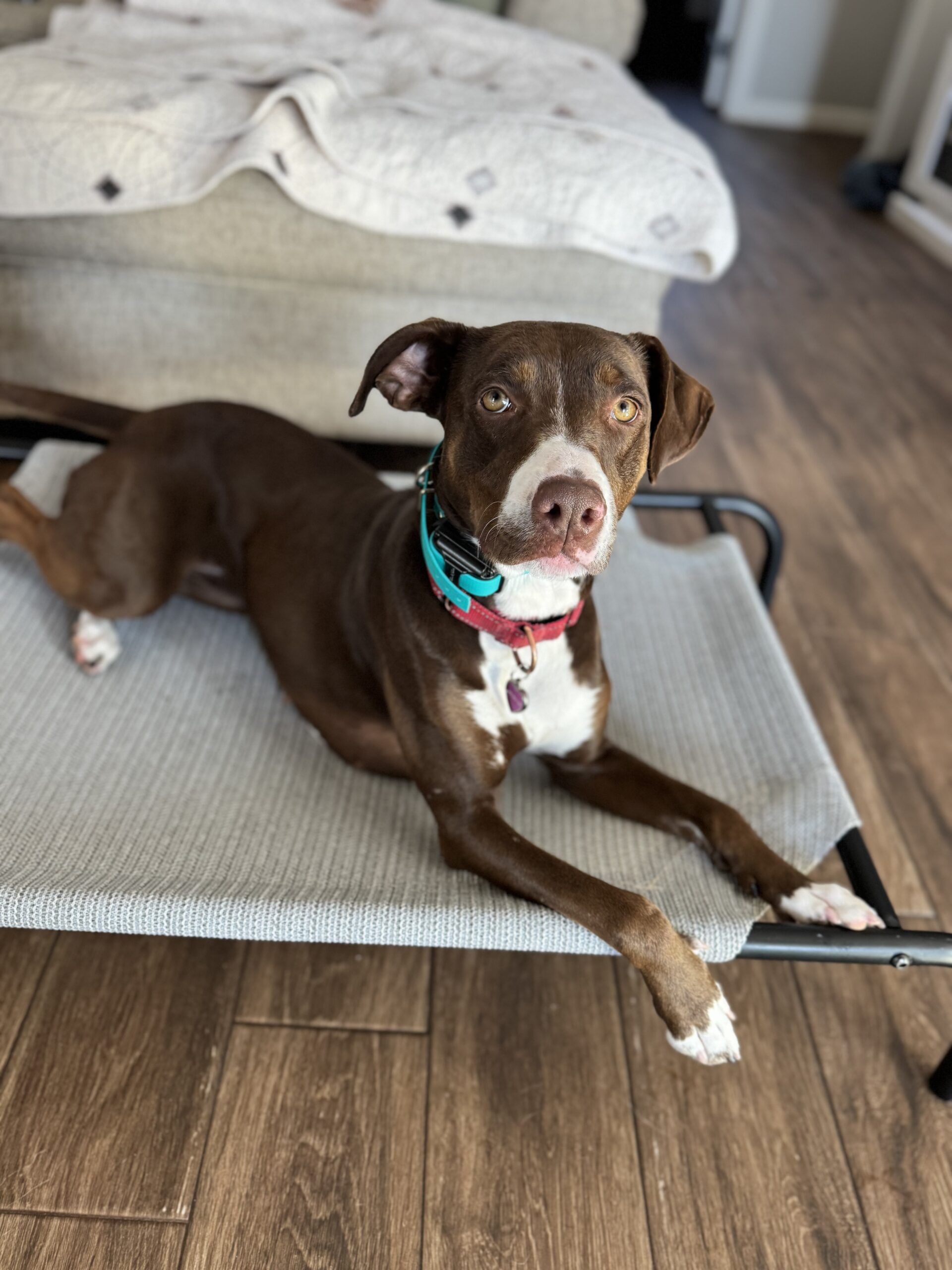 Ruby is a 3 year old, 44 lb sweetheart with a loving and athletic spirit. She loves romping outside, squeaky toys, learning new things, and curling up for cuddles with her people. She absolutely lights up when she sees familiar people. Her tail wag is endless and she happily soaks up belly rubs and affection. She’s housebroken, crate trained and has lived happily in a family setting with kids, dogs, and cats.