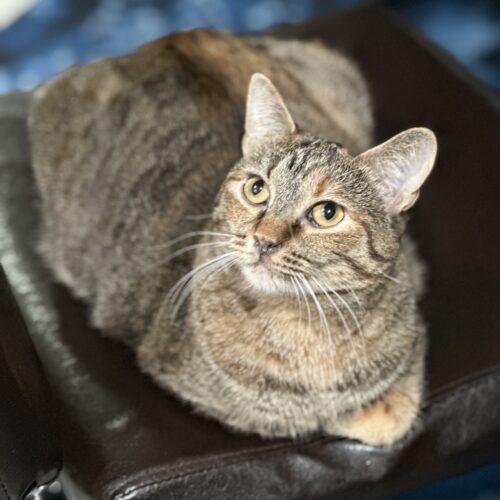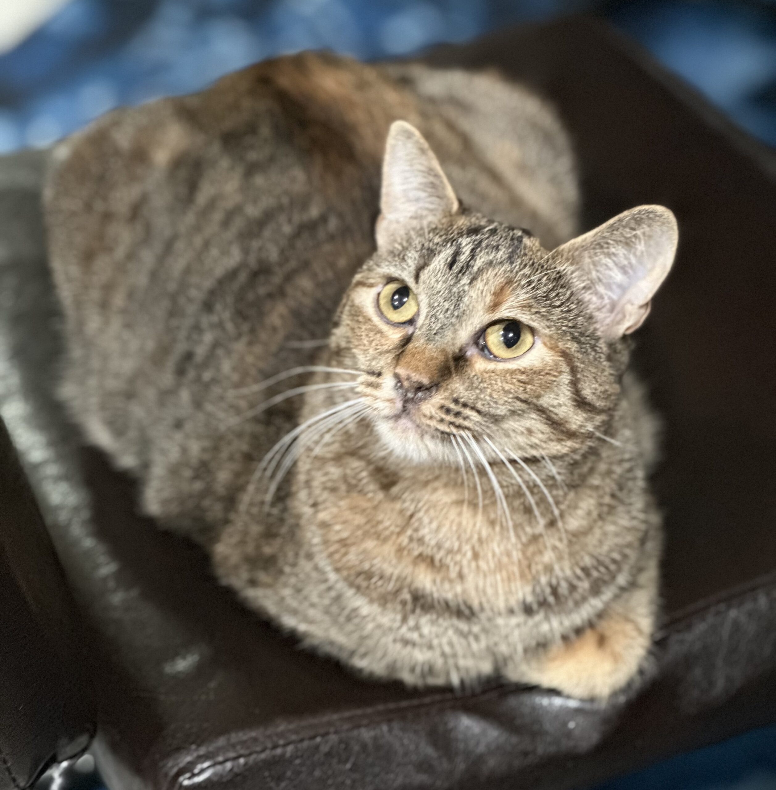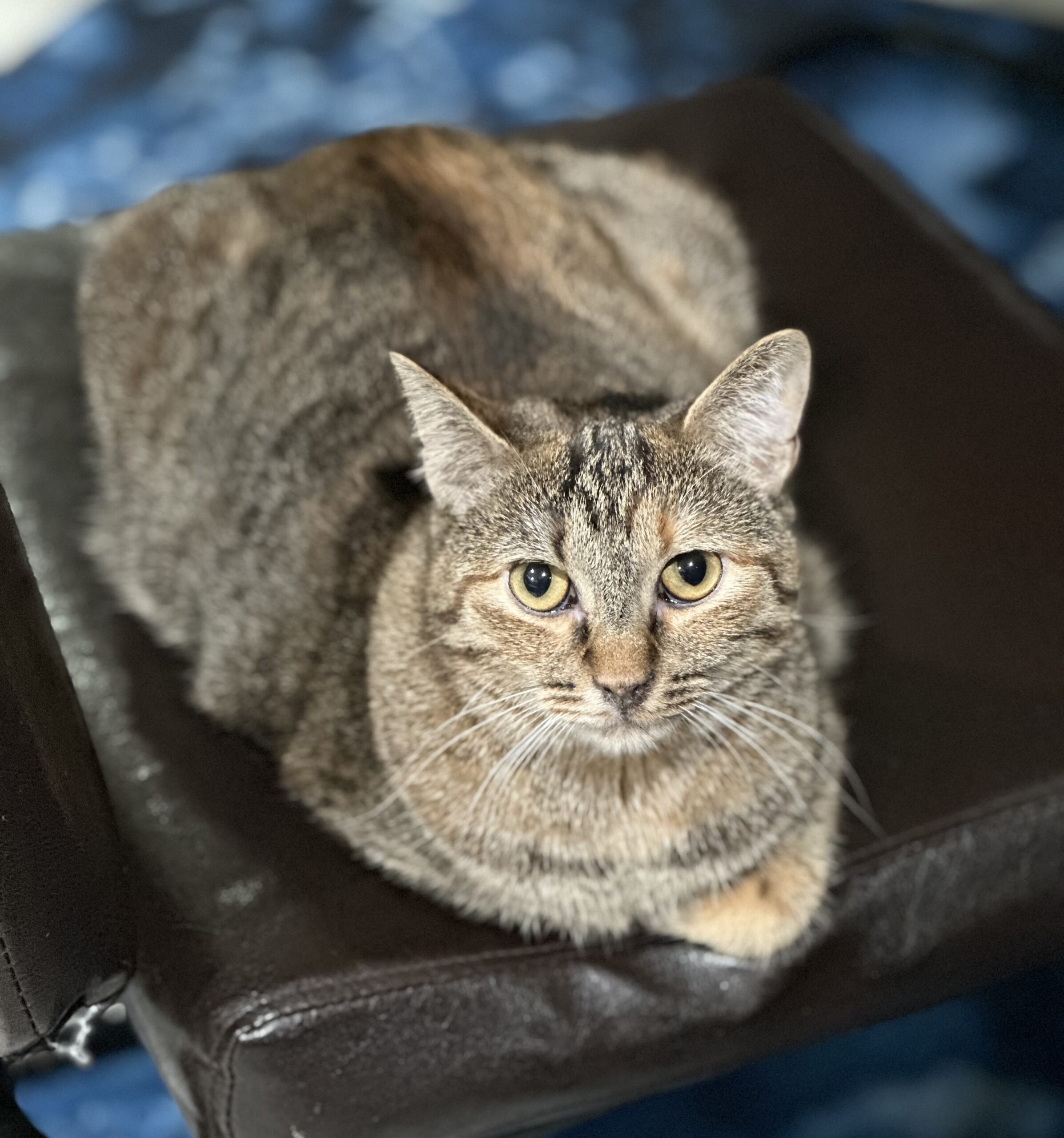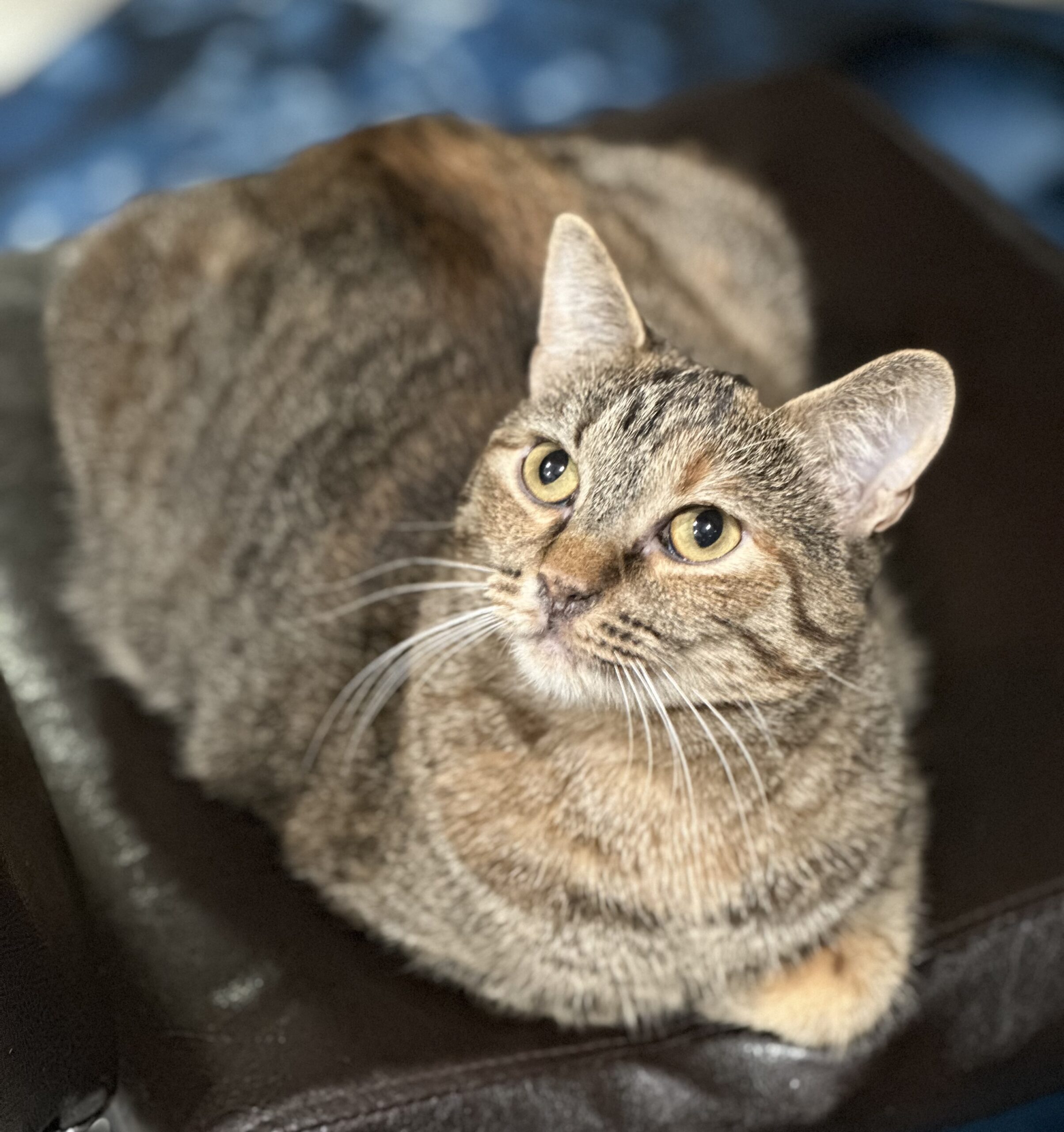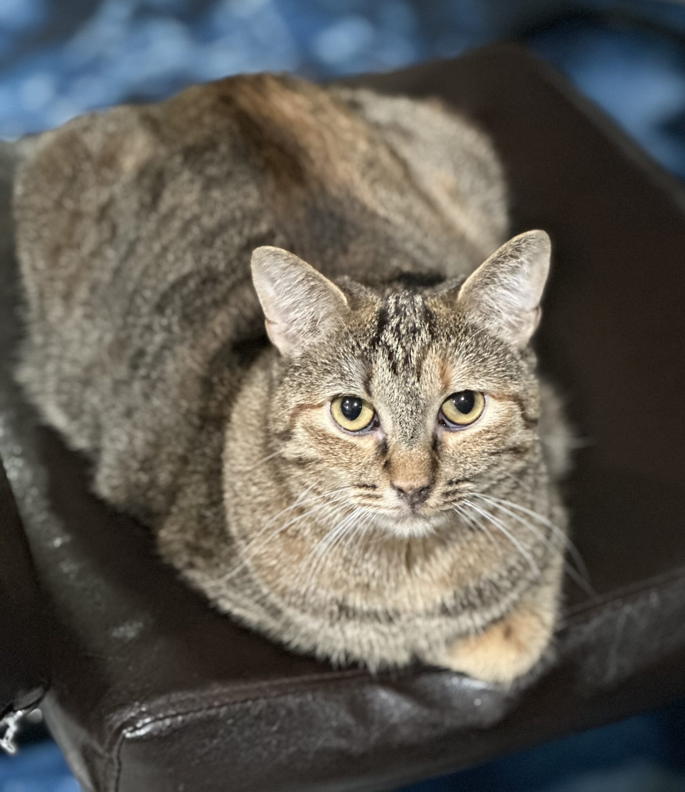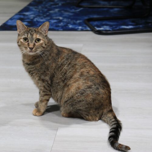 My sister and I came to the rescue as tiny kitties when a community member had an accidental litter. Unfortunately, we became sick and it was discovered we had panluek (similar to parvo in dogs). My foster took great care of my sister and I and weaned us back to health! While I may appear at first glance to be just a regular ole tabby kitten, I have unique markings of both stripes AND polka dots with caramel coloring, believed to be Egyptian Mau breed! I can be a bit shy/timid at first, but give me treats and we will be best friends! I’ll even let you give me butt scratches while I do a little chirp for you! And yes, my face always looks like I’m either worried or have RBF, but I am a sweet kitty!