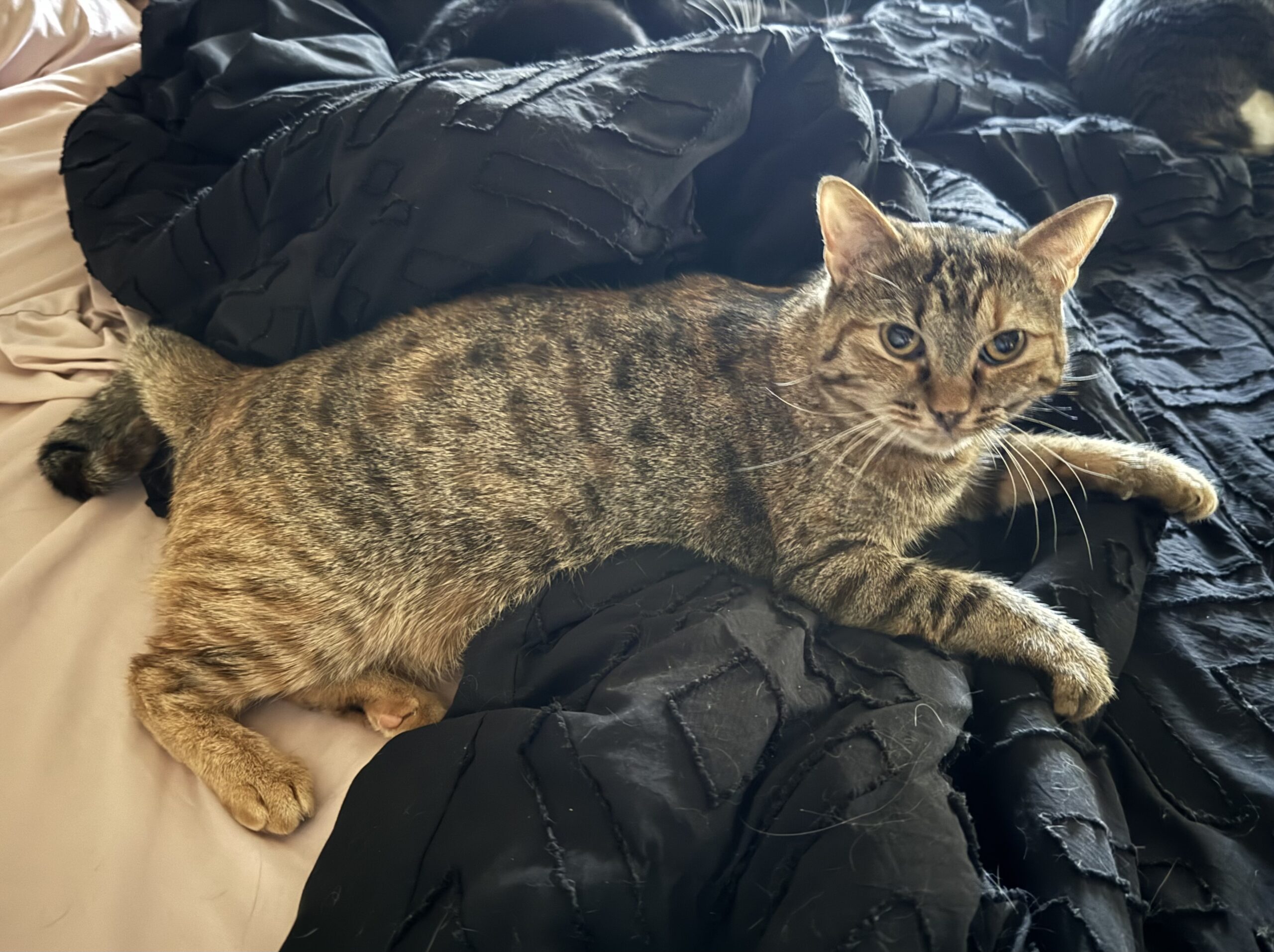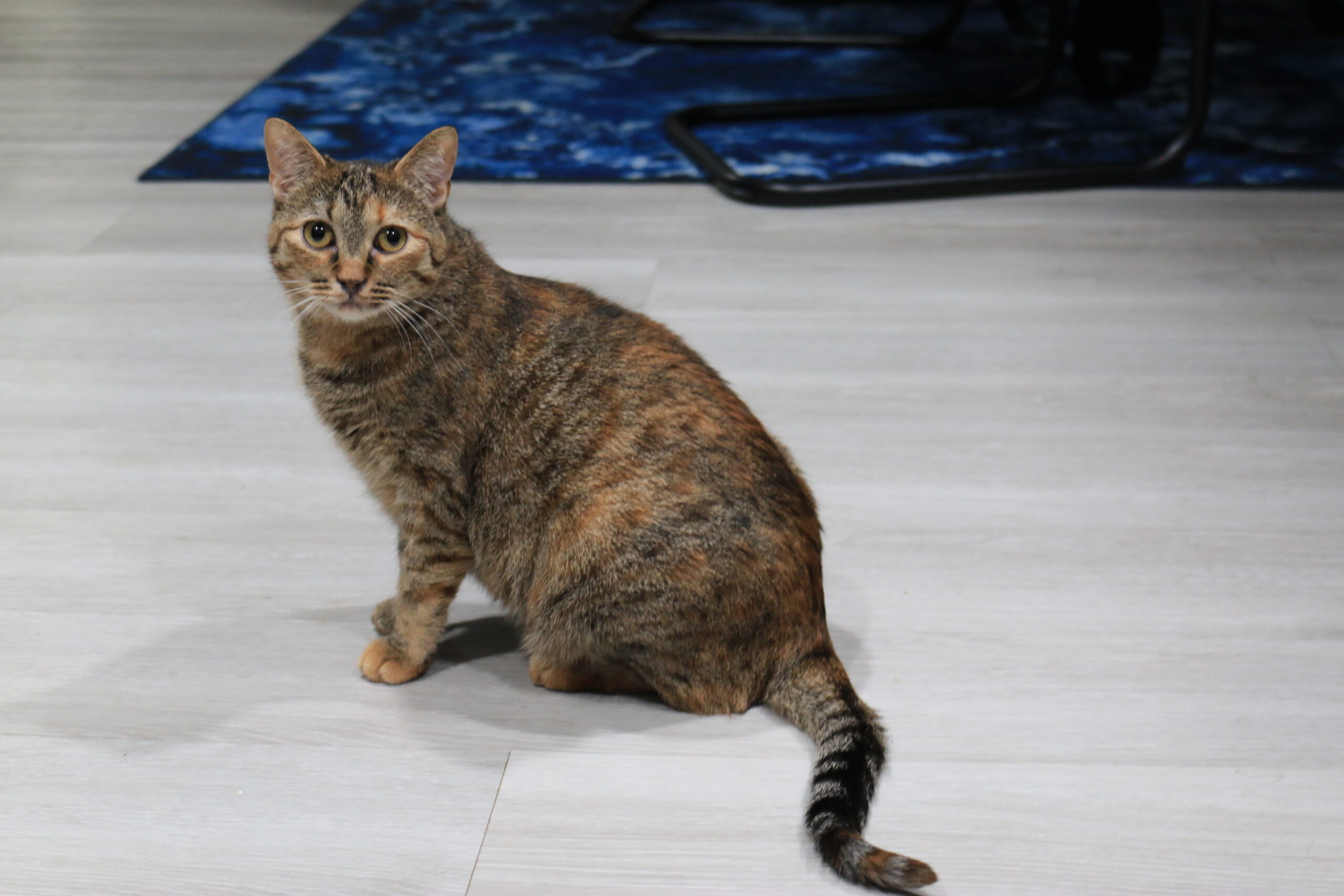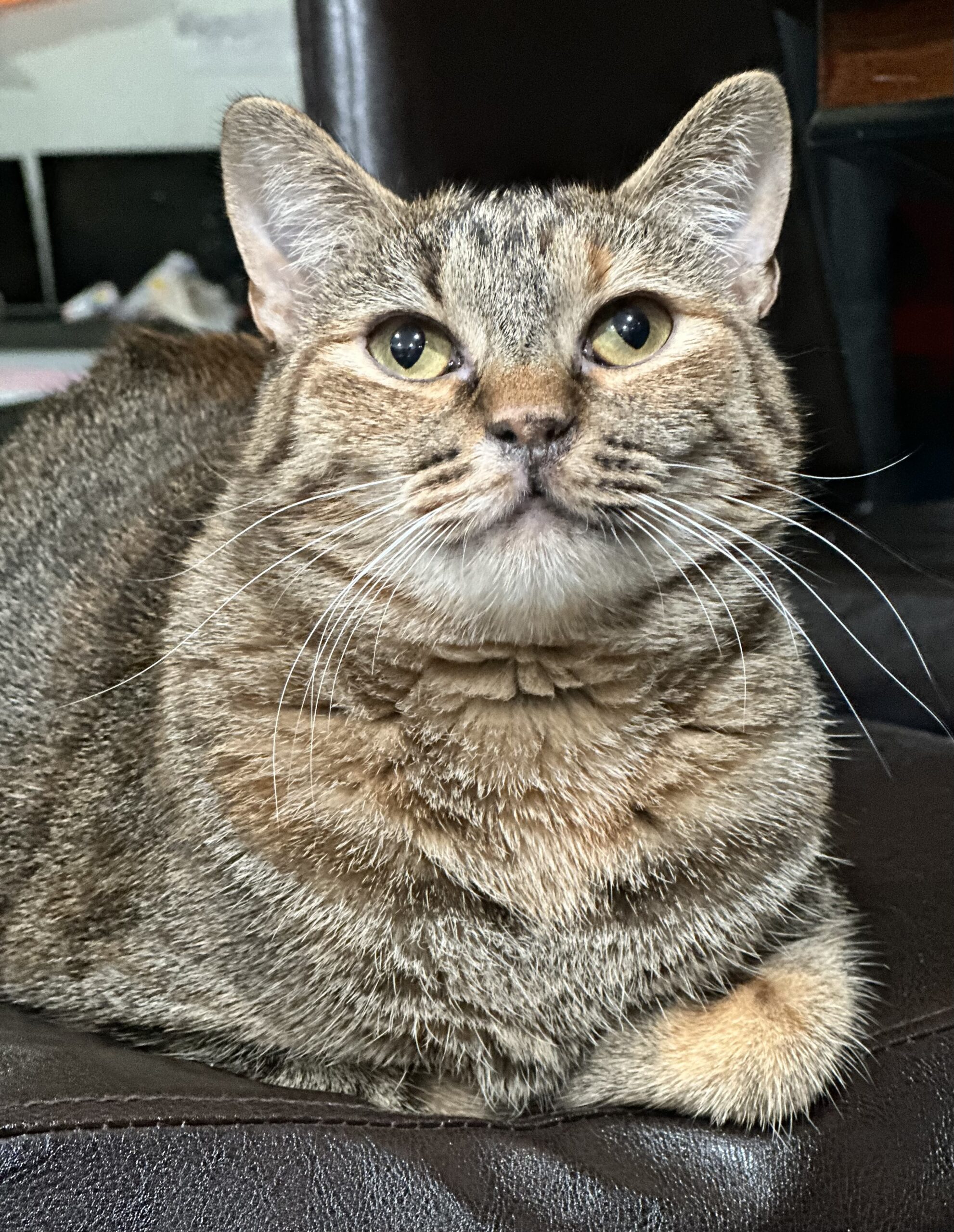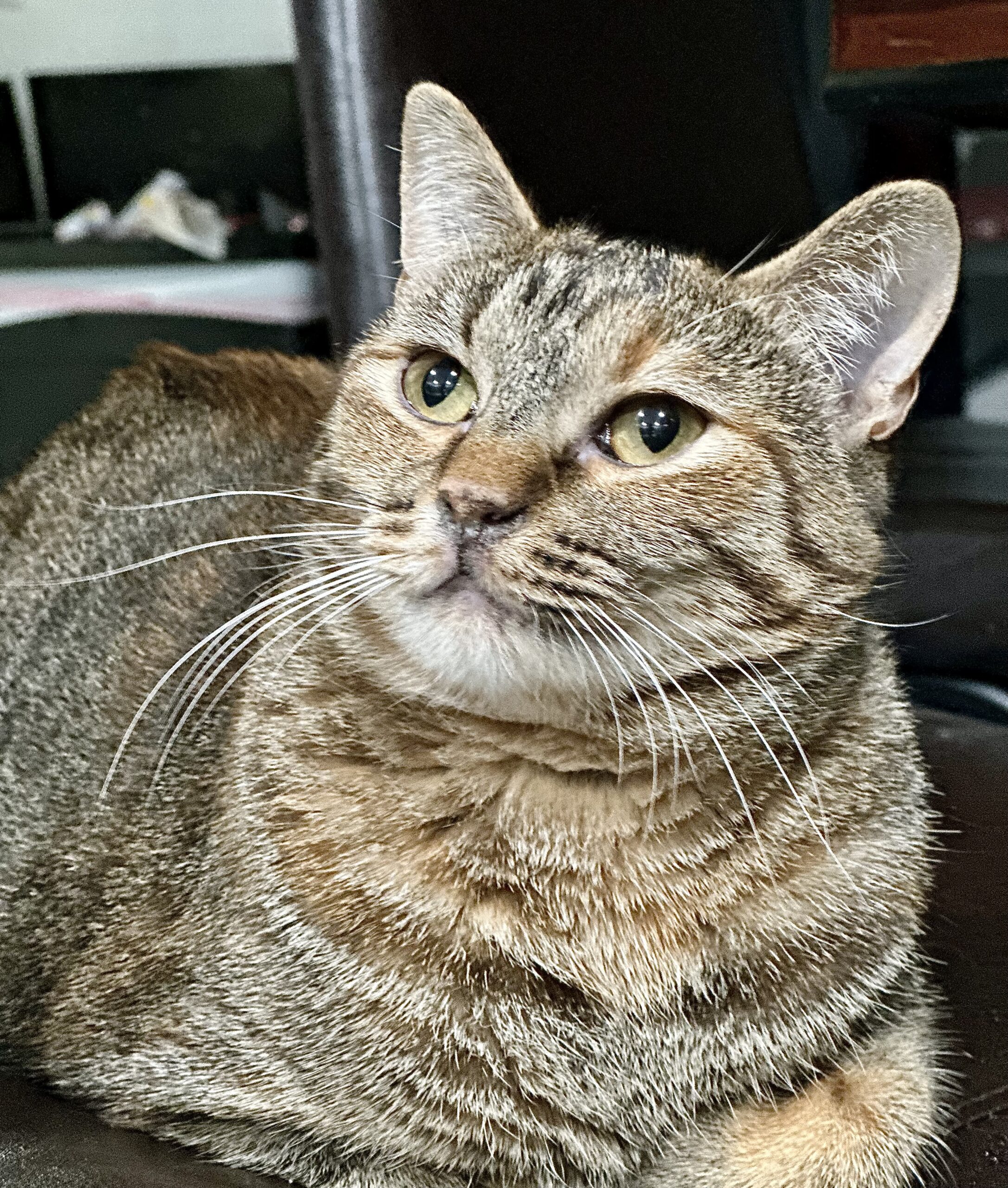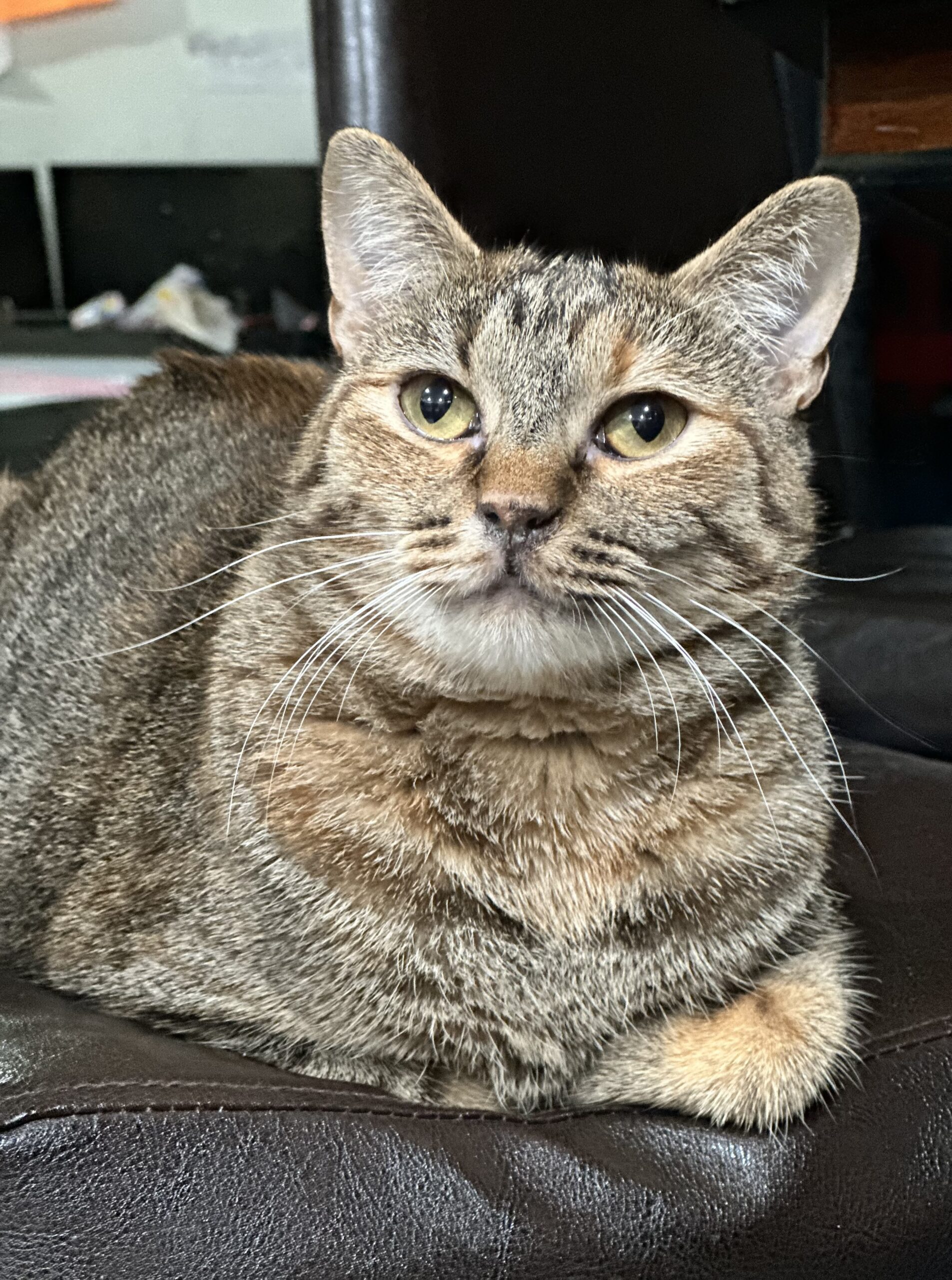 My sister and I came to the rescue as tiny kitties when a community member had an accidental litter. Unfortunately, we became sick and it was discovered we had panluek (similar to parvo in dogs). My foster took great care of my sister and I and weaned us back to health! While I may appear at first glance to be just a regular ole tabby kitten, I have unique markings of both stripes AND polka dots with caramel coloring, believed to be Egyptian Mau breed! I can be a bit shy/timid at first, but give me treats and we will be best friends! I’ll even let you give me butt scratches while I do a little chirp for you! And yes, my face always looks like I’m either worried or have RBF, but I am a sweet kitty!